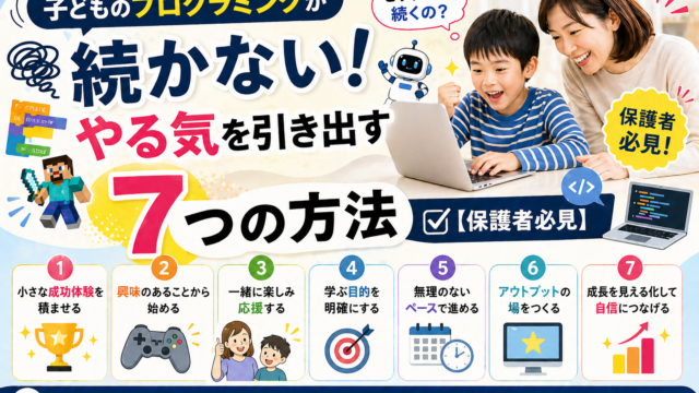 プログラミング教室の体験授業で保護者が確認すべき質問10選を紹介。費用・カリキュラム・振替制度など入会前に必ず聞くべき項目をチェックリスト形式でまとめました。