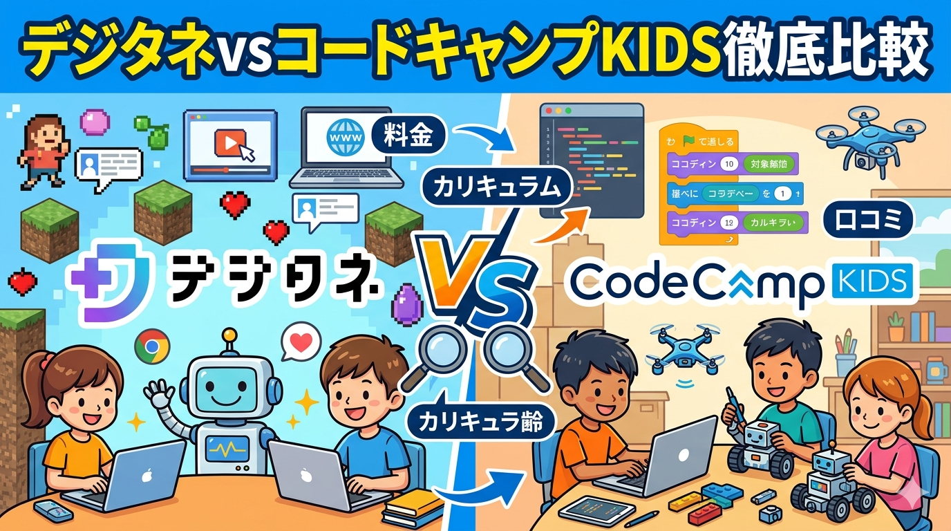 子ども向けオンラインプログラミング教室を探していると、よく候補に挙がる「デジタネ」と「コードキャンプKIDS」。どちらもオンラインで学べる人気スクールですが、料金体系や指導スタイルに大きな違いがあります。この記事では両校を徹底比較し、どんなお子さんにどちらが向いているかをわかりやすく解説します。