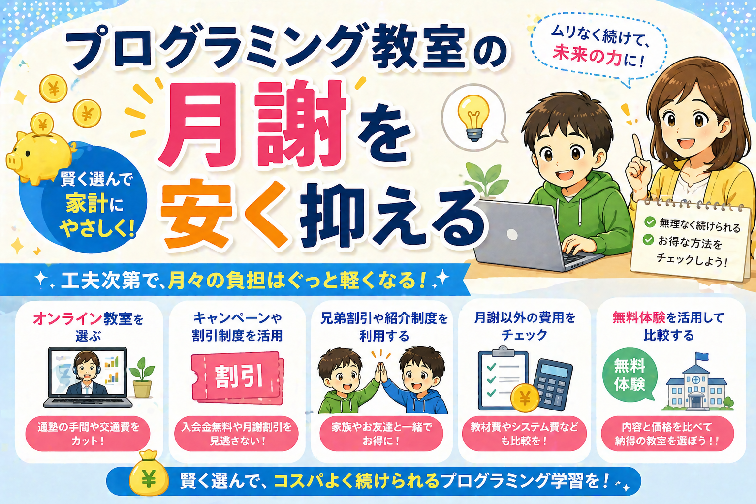 「プログラミング教室に通わせたいけど、月謝が高くて家計が心配」「できるだけ費用を抑えながら質の良い教育を受けさせたい」という親御さんへ。